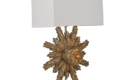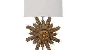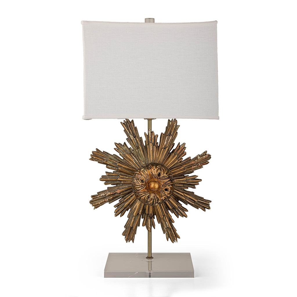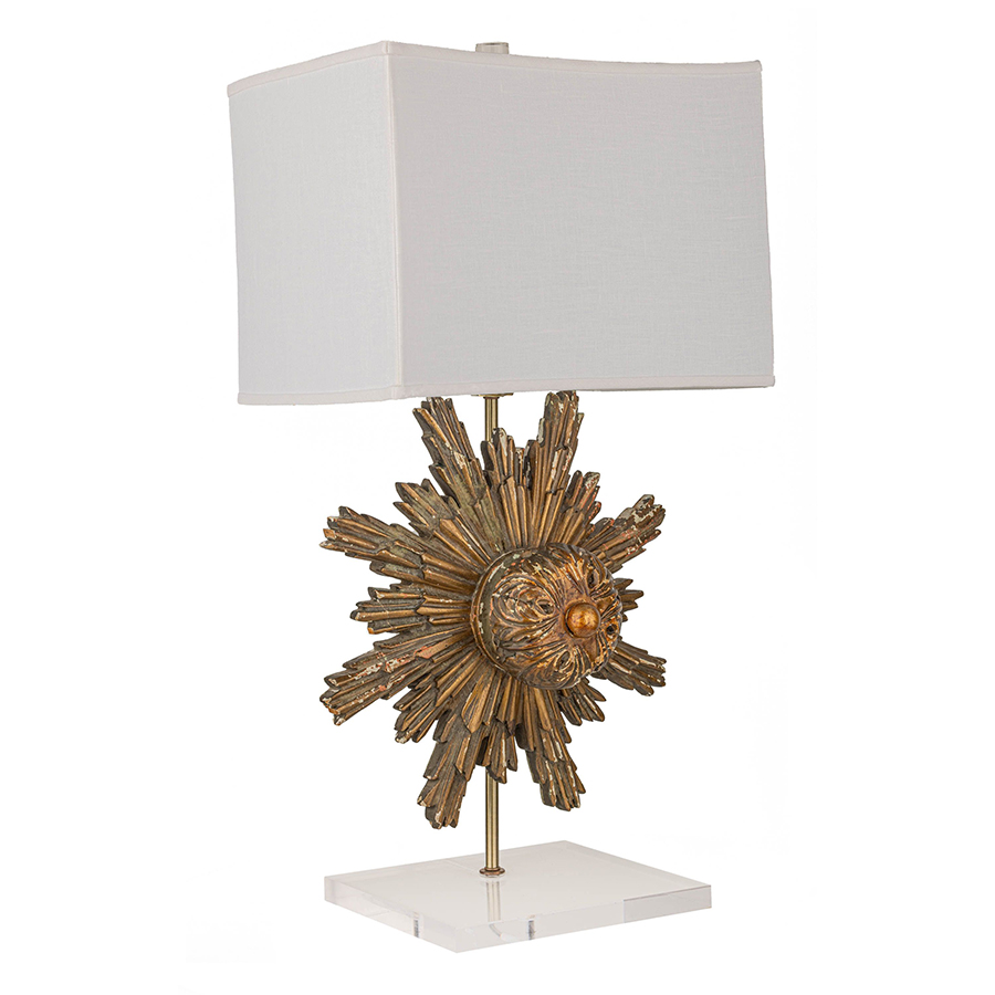 Carved three-dimensional gilt starburst attached to a metal rod and mounted on an acrylic base. Acrylic cylinder finial with white linen shade, which has a convex shape on the wide sides making this lamp truly special.